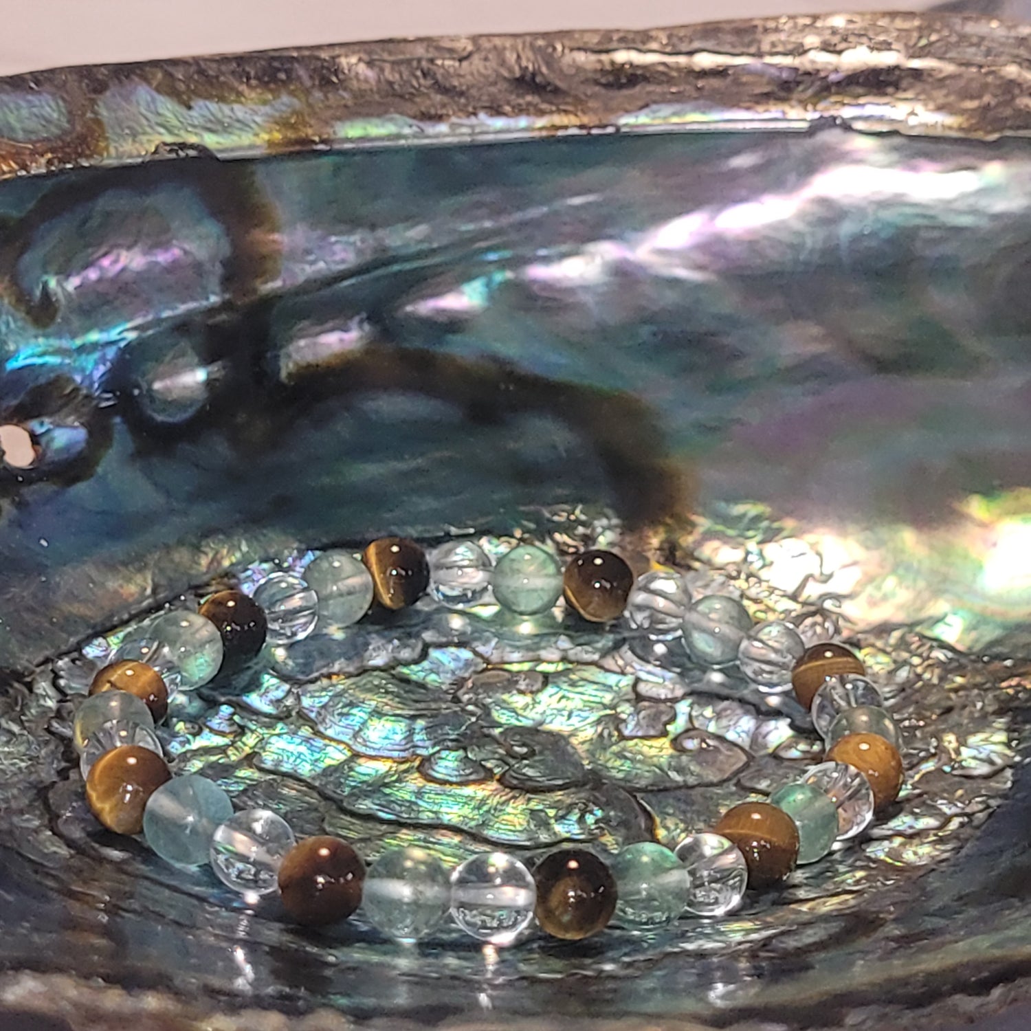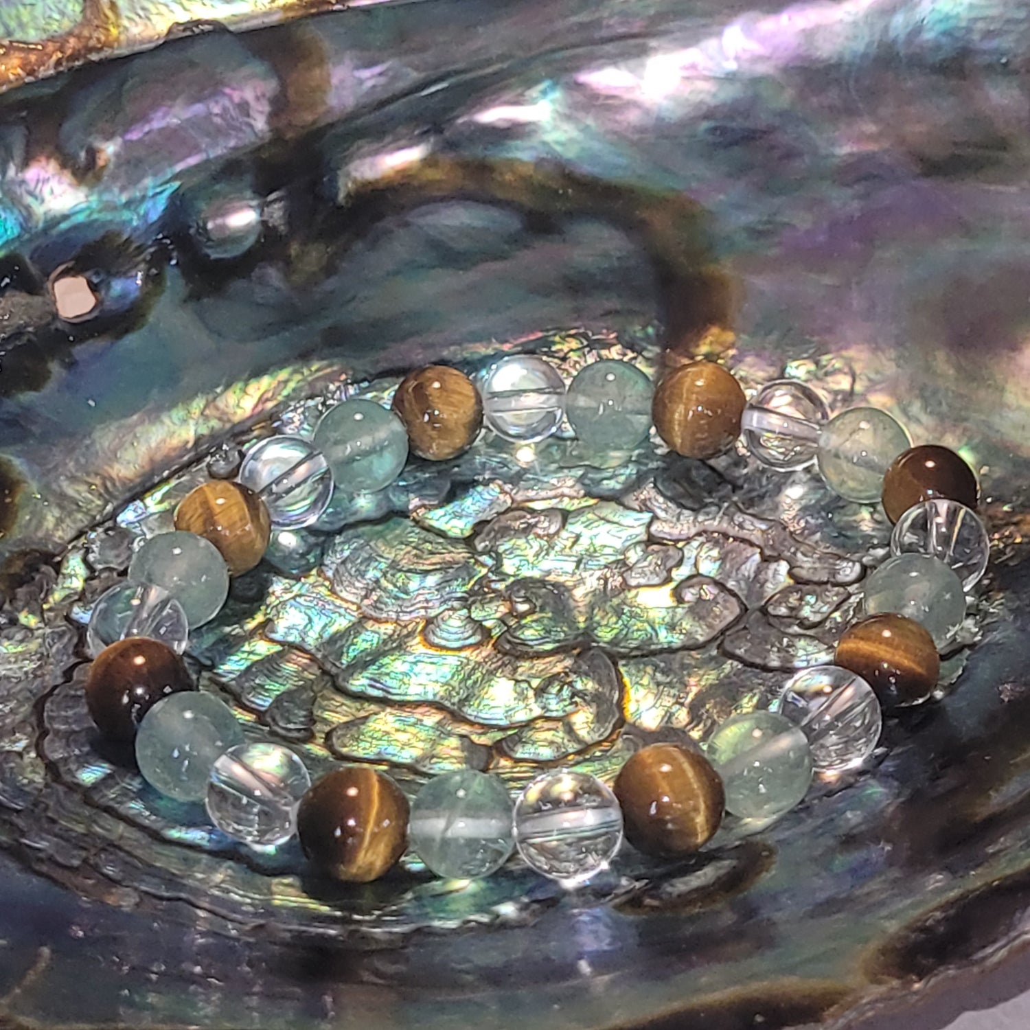 L’Œil de Tigre, pierre de focus et de discernement, aide à avancer avec lucidité et détermination. La Fluorite Verte, pierre de clarté mentale, organise les pensées et apaise les ruminations. Le Cristal de Roche, amplificateur énergétique, harmonise l’ensemble et renforce la fluidité intérieure.
