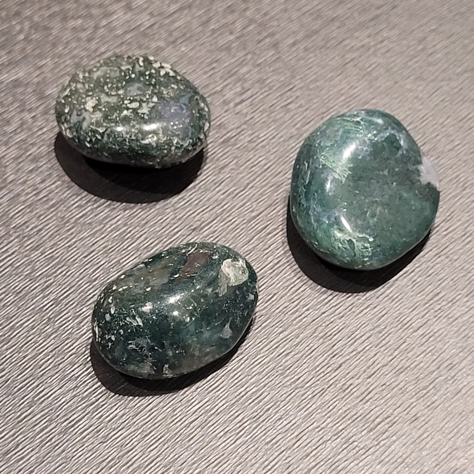 L’Agate Mousse est une pierre douce et apaisante, reconnaissable à ses nuances de vert profond mêlées de reflets blancs ou translucides. Ces galets de 2 à 3 cm environ portent en eux la fraîcheur d’un sous-bois après la pluie.