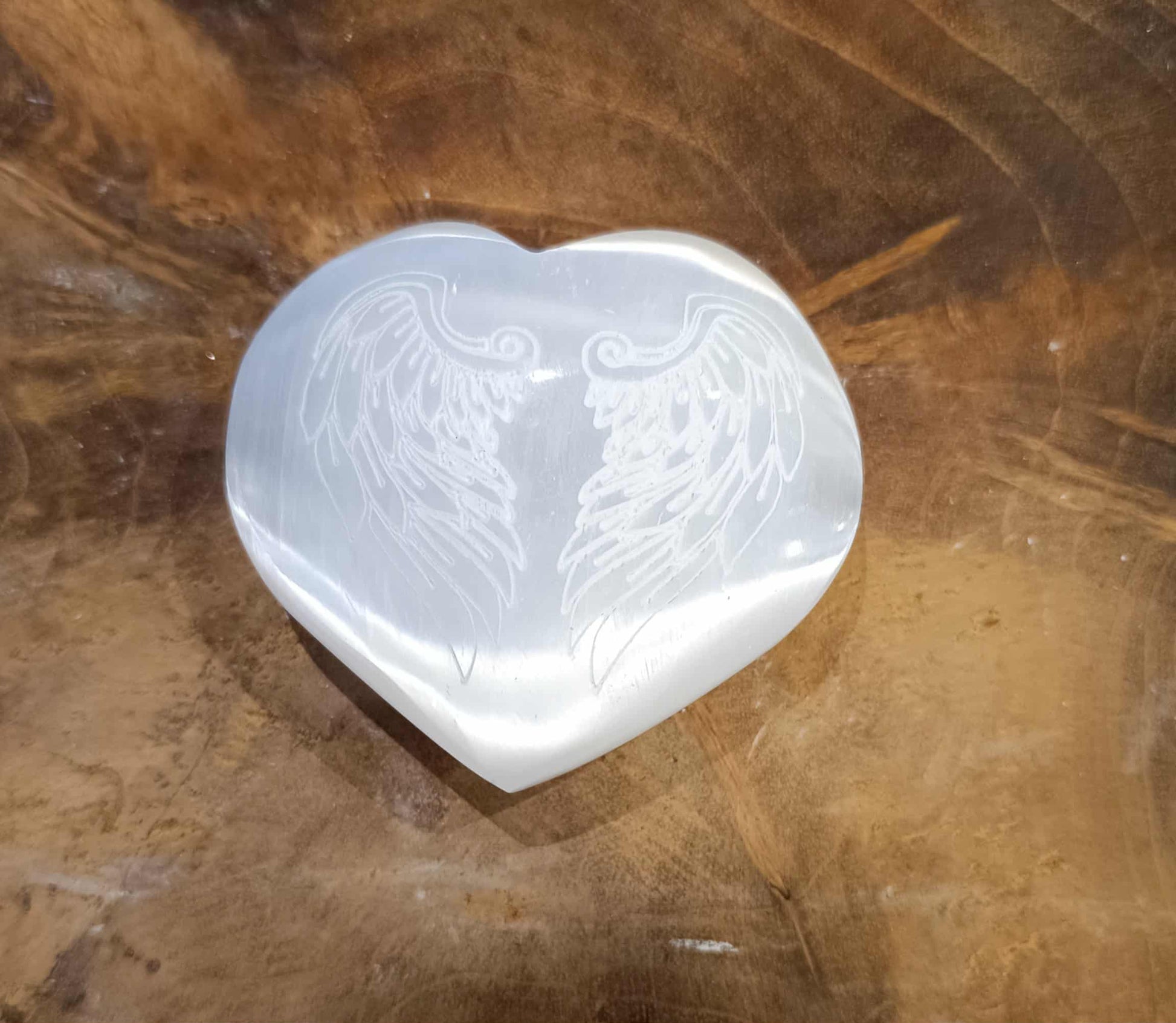 Ce cœur en Sélénite gravé d’ailes d’ange évoque la protection, la bienveillance et la pureté. La Sélénite, pierre de lumière et de clarté, diffuse une vibration douce qui apaise l’esprit et purifie les énergies environnantes. Les ailes d’ange symbolisent la guidance divine et l’accompagnement spirituel, rappelant la présence réconfortante des forces célestes.