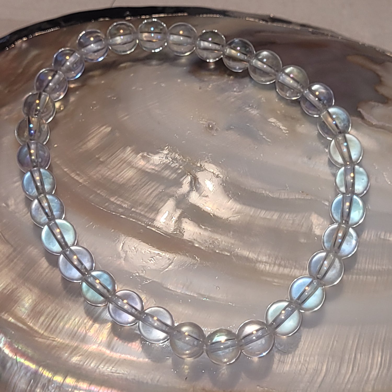 Le bracelet en Quartz Aura Blanche est une véritable ode à la lumière. Ce cristal de roche pur, sublimé par une fine vaporisation métallique, révèle des reflets arc-en-ciel délicats, évoquant la connexion céleste et la clarté intérieure.