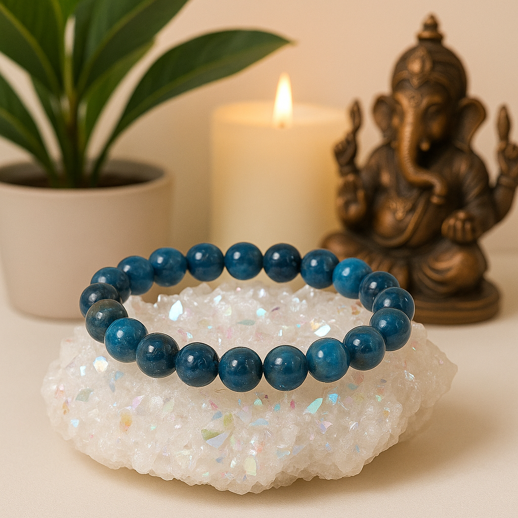 Porter ce bracelet en apatite bleue, c’est choisir une pierre d’ouverture et de clarté, qui soutient la communication, renforce la confiance en soi et favorise la concentration. Elle accompagne idéalement les moments d’étude, de création ou de prise de parole, en offrant équilibre et fluidité.
