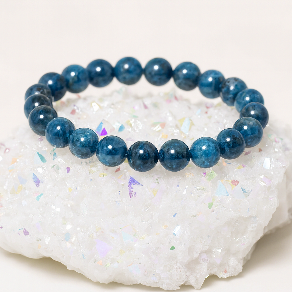 Le bracelet en apatite bleue se distingue par ses nuances intenses, allant du bleu clair au bleu profond, qui rappellent la fluidité de l’eau et la transparence des mots. Pierre de communication, elle accompagne celles et ceux qui souhaitent exprimer leurs pensées avec sincérité et confiance.