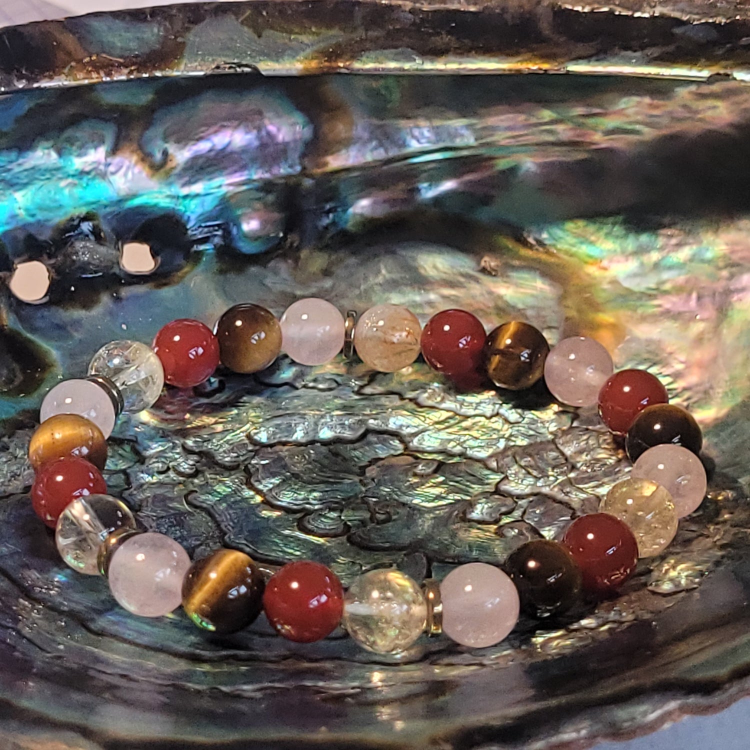Ce bracelet combine la vitalité solaire de la citrine, la force créative de la cornaline, la protection de l’œil de tigre et la douceur du quartz rose. Ensemble, ces pierres soutiennent la confiance en soi, favorisent l’équilibre émotionnel et inspirent un rayonnement naturel au quotidien.
