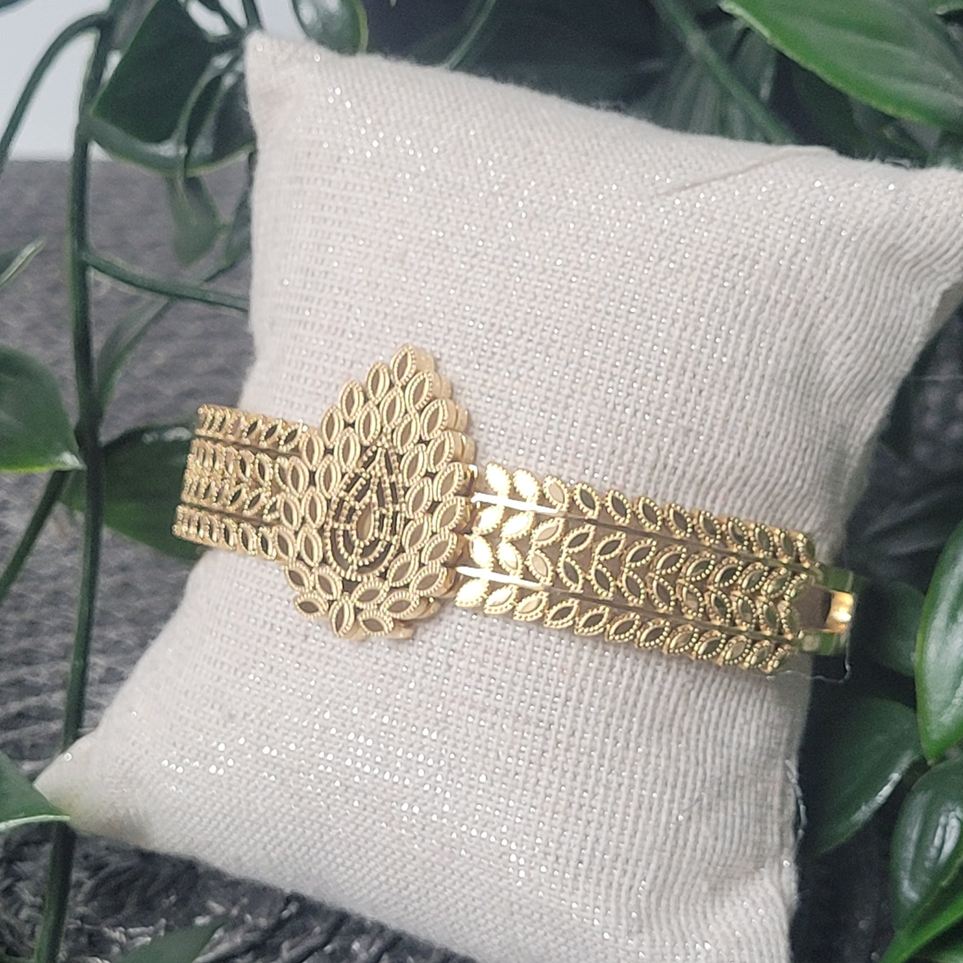 Fabriqué en acier inoxydable doré, ce bracelet résiste à l’humidité, aux frottements et au ternissement. Il conserve ainsi toute sa brillance, même porté au quotidien. Son système d’ouverture par l’avant rend sa mise en place particulièrement simple : il suffit d’écarter légèrement les deux extrémités pour l’ouvrir, puis de le refermer délicatement autour du poignet. Sa construction légère et ajourée offre un port confortable, sans sensation de lourdeur
