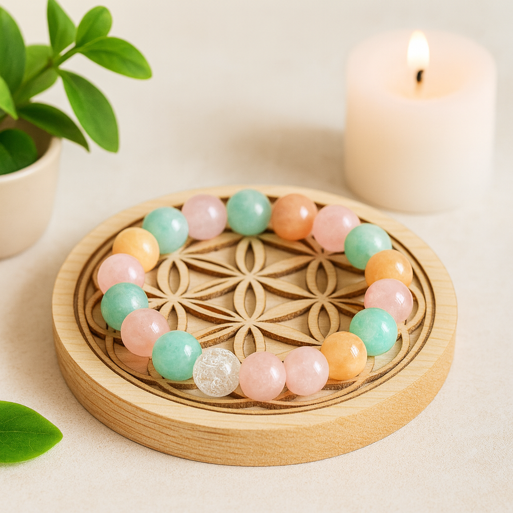 Monté sur un élastique résistant, il s’adapte facilement à toutes les tailles de poignet. Ses teintes chaleureuses de doré, de rose et de bleu pastel reflètent l’harmonie et diffusent une vibration rayonnante au quotidien. Porté sur le poignet, il aide à dissiper la mélancolie, à retrouver confiance et à s’ouvrir pleinement aux belles énergies de la vie.