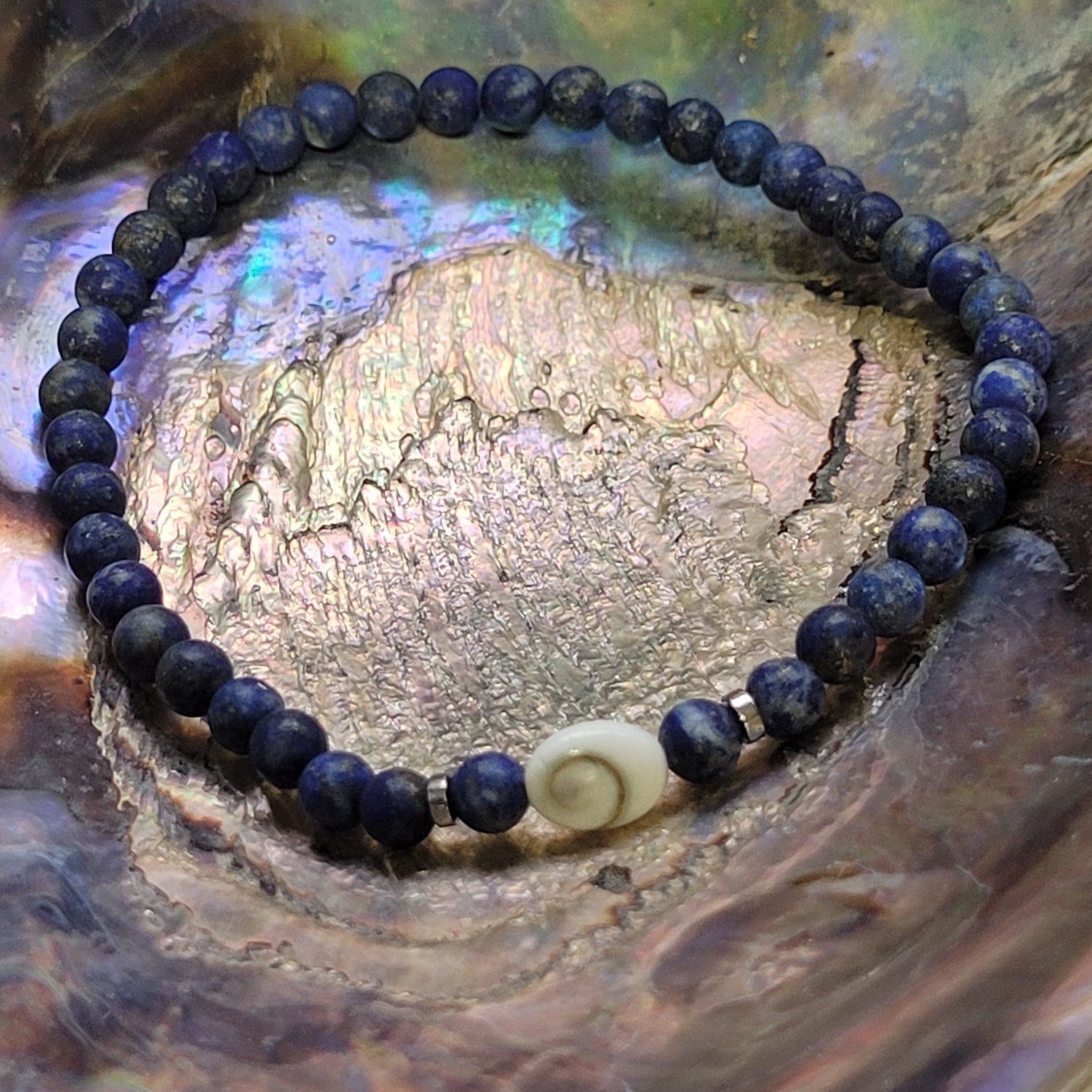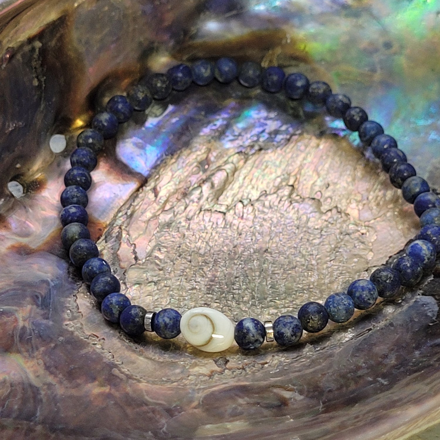 Ce bracelet en lapis-lazuli mat de 4 mm évoque la profondeur des océans et le silence intérieur. Chaque perle diffuse une énergie douce et stable, invitant au recentrage et à la confiance en soi. Le bijou est sublimé par un Œil de Sainte-Lucie, symbole ancestral de chance et de protection, issu du coquillage méditerranéen du même nom.