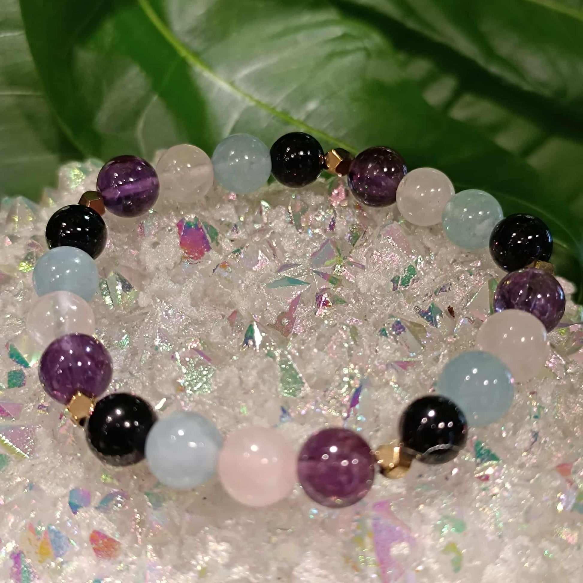 Ce bracelet réunit protection, douceur et clarté dans un bijou élégant. Grâce à l’alliance de l’améthyste, du quartz rose, de l’aigue-marine et de l’onyx, il soutient le Verseau dans sa quête d’équilibre entre l’esprit, le cœur et l’énergie vitale.