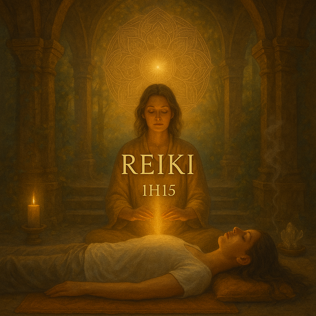 – La séance Reiki (+/- 1h15), une méthode douce qui canalise l’énergie universelle afin de rétablir l’harmonie intérieure, réduire la fatigue et favoriser la sérénité mentale.