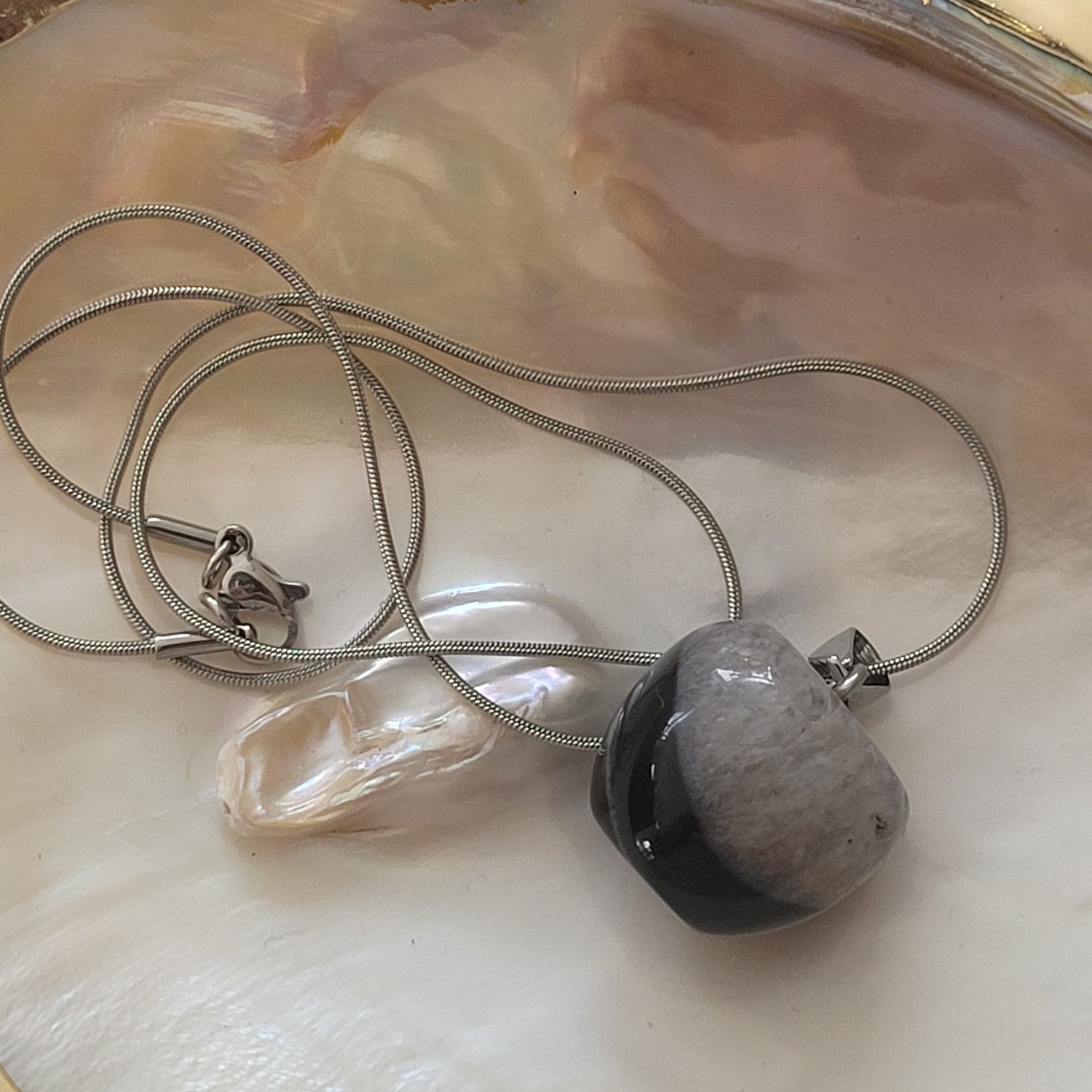 Ses teintes nuancées de gris, de noir et de blanc rappellent l’équilibre entre yin et yang, offrant une énergie à la fois douce et protectrice.