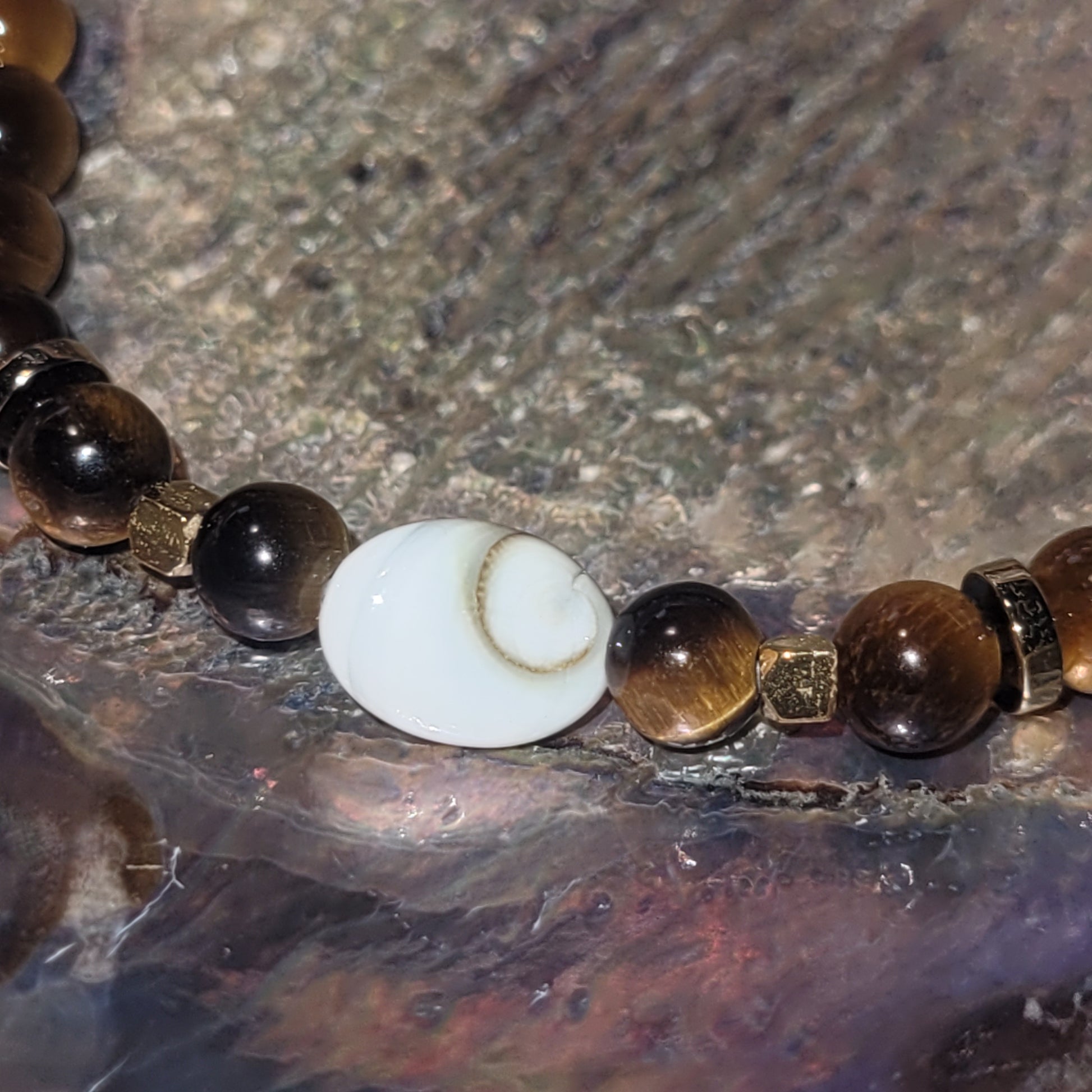 Ce bracelet associe deux symboles puissants : l’Œil de Tigre, pierre d’ancrage et de protection, et l’Œil de Sainte-Lucie, talisman marin réputé pour attirer la chance et éloigner le mauvais œil. Ensemble, ils créent une synergie harmonieuse entre force intérieure et sérénité.