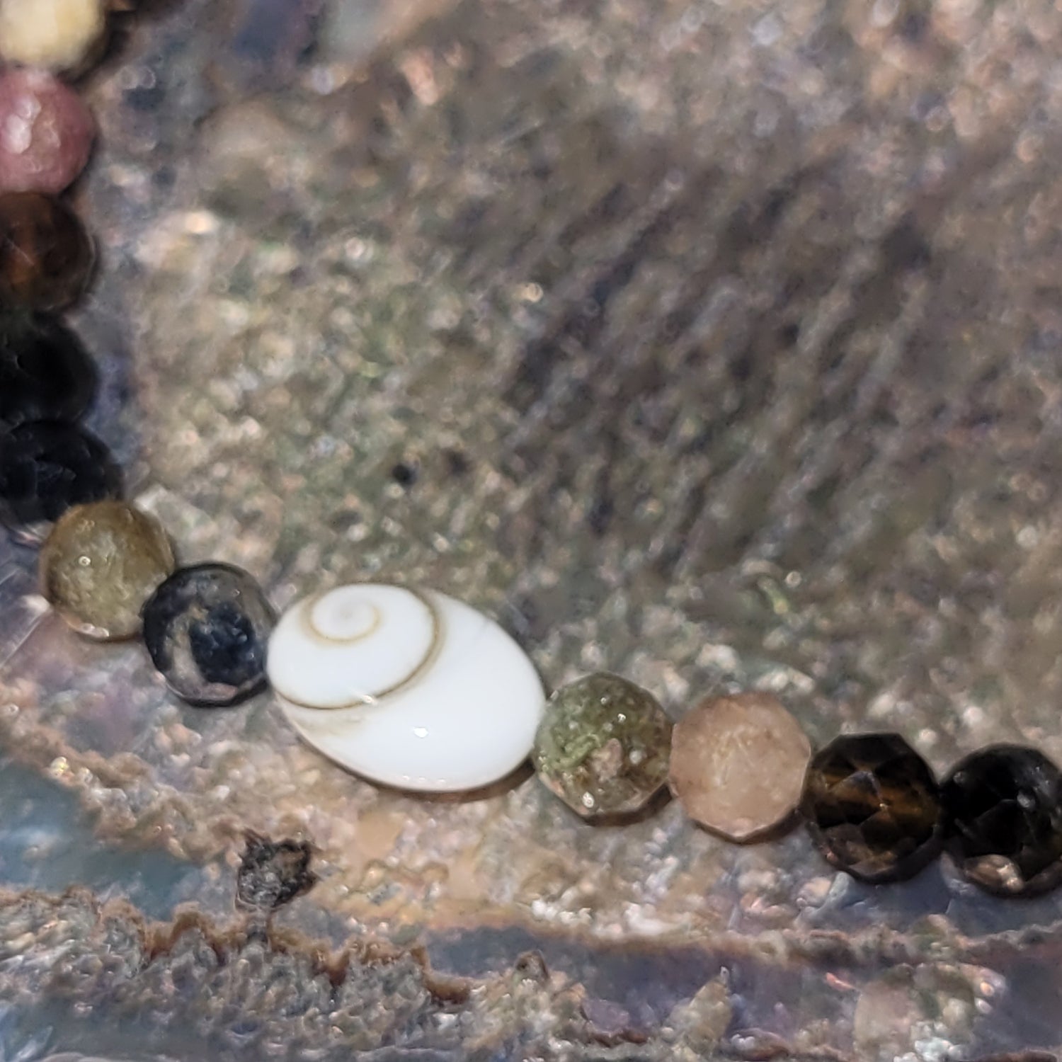Ce bracelet associe la tourmaline mixte, pierre d’équilibre et de transformation, à l’Œil de Sainte-Lucie, coquillage porte-bonheur lié à la protection et à la clarté. Ensemble, ils unissent la douceur des émotions à la stabilité intérieure, apportant une énergie lumineuse et apaisante.