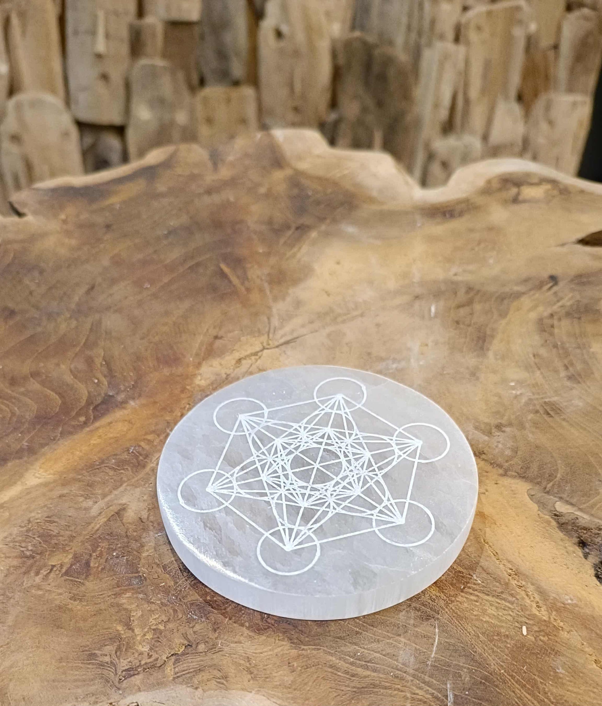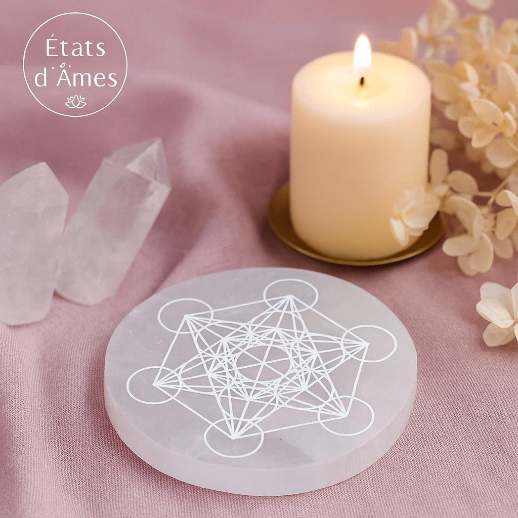 Le Cube de Métatron en Sélénite est un symbole sacré associé à la protection et à la connexion spirituelle. Gravé sur un plateau rond d’environ 10 cm de diamètre, il diffuse une énergie douce et purificatrice. La Sélénite, pierre de sérénité et de clarté, nettoie naturellement les minéraux des énergies stagnantes tout en amplifiant leur rayonnement.