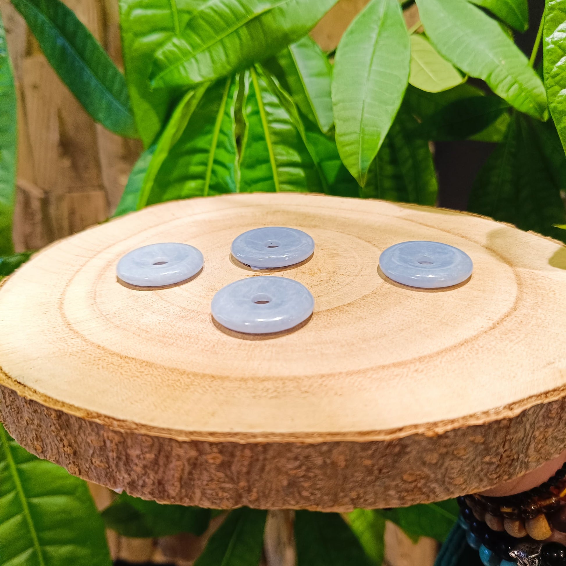 Le donut en angélite est une pierre apaisante d’un bleu tendre, associée à la douceur et à la paix intérieure. Reliée au chakra de la gorge et au chakra du troisième œil, elle facilite la communication bienveillante et l’ouverture spirituelle. Traditionnellement, l’angélite est réputée pour renforcer le lien avec les anges et les guides, apportant un sentiment de protection subtile et d’accompagnement.