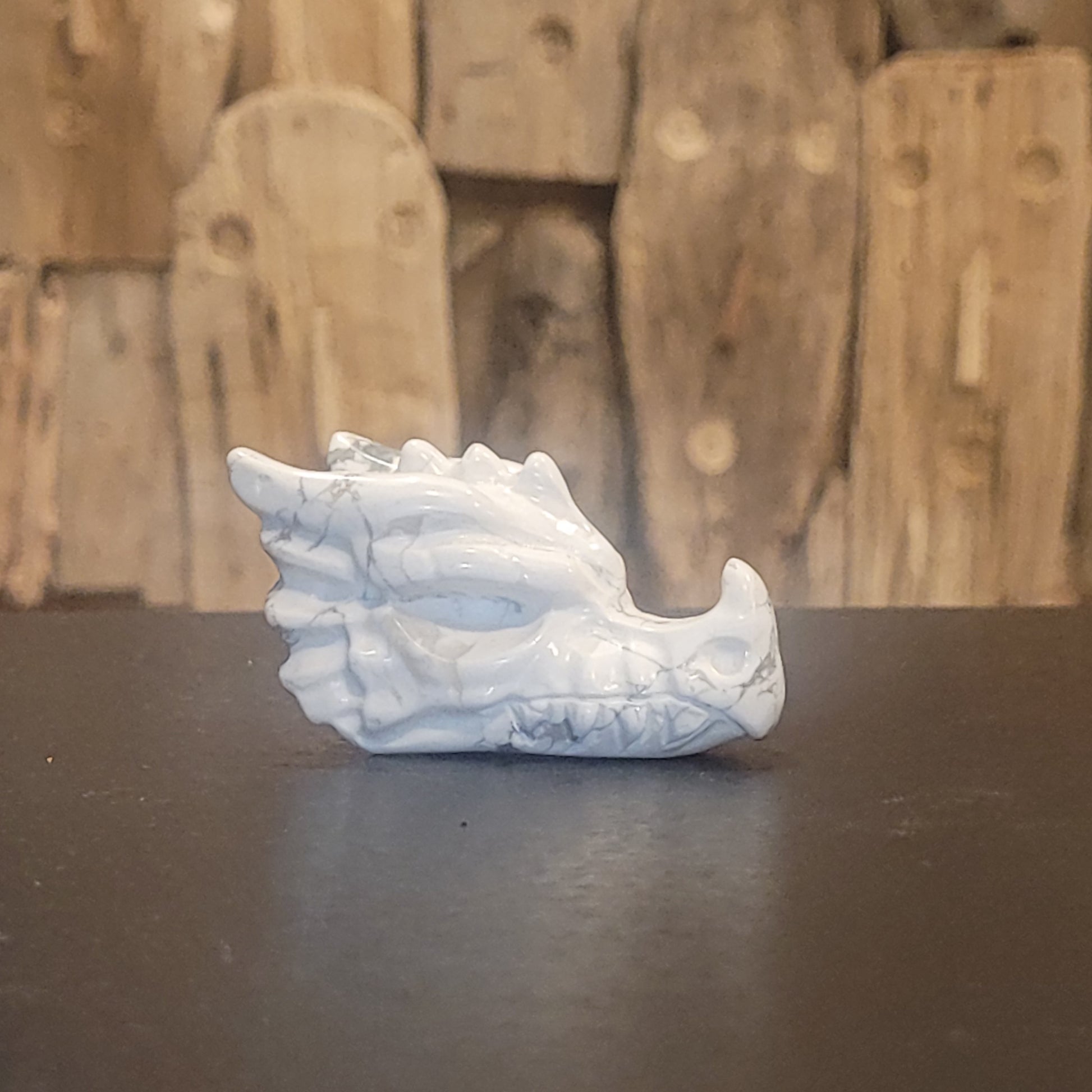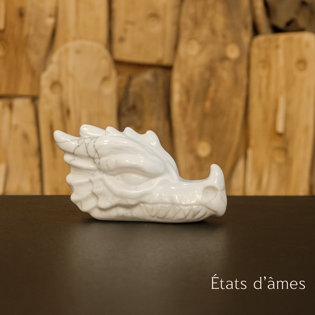 Cette tête de dragon sculptée en Howlite incarne à la fois la puissance et la sérénité. L’Howlite, pierre blanche veinée de gris, est connue pour apaiser le mental et calmer les émotions. Elle invite à la réflexion et à la douceur, tout en favorisant la stabilité intérieure.