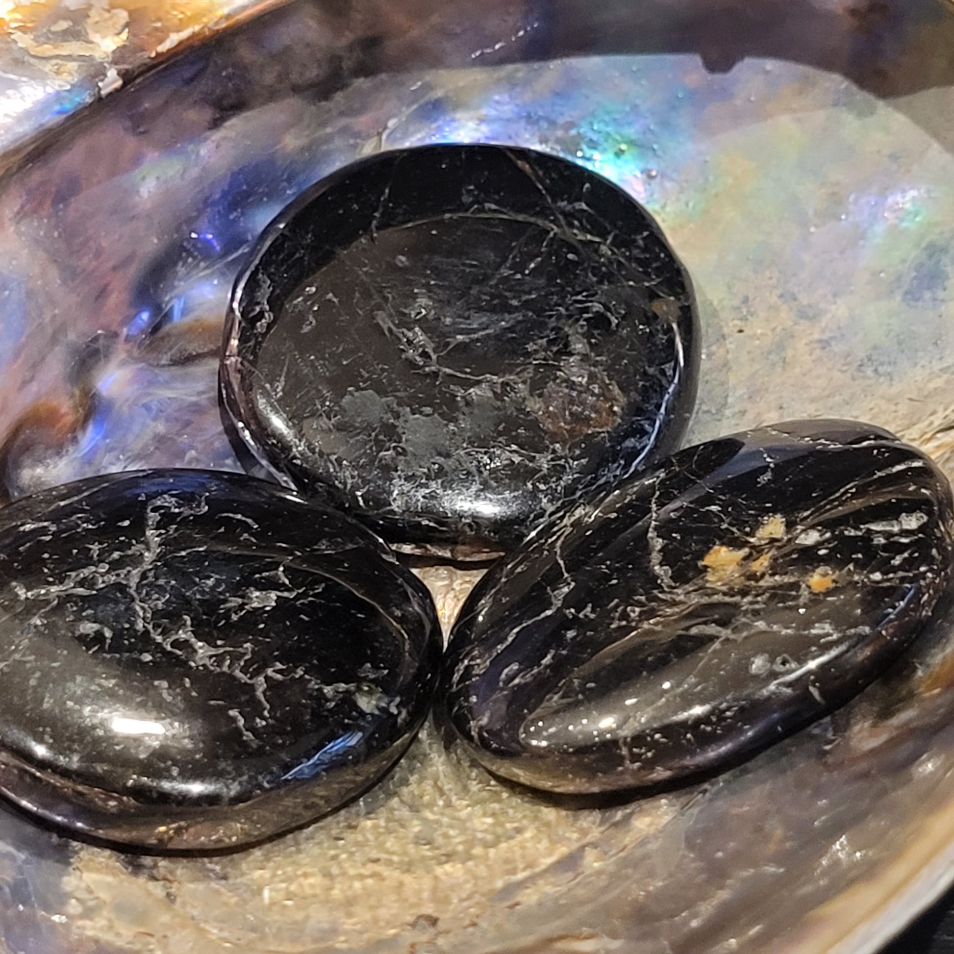 L’Hypersthène est une pierre d’un noir profond aux reflets argentés ou irisés, évoquant un ciel nocturne traversé de lumière. Ces pierres plates de 3 à 5 cm environ sont idéales à garder sur soi ou à poser sur le chakra racine pour un ancrage stable.