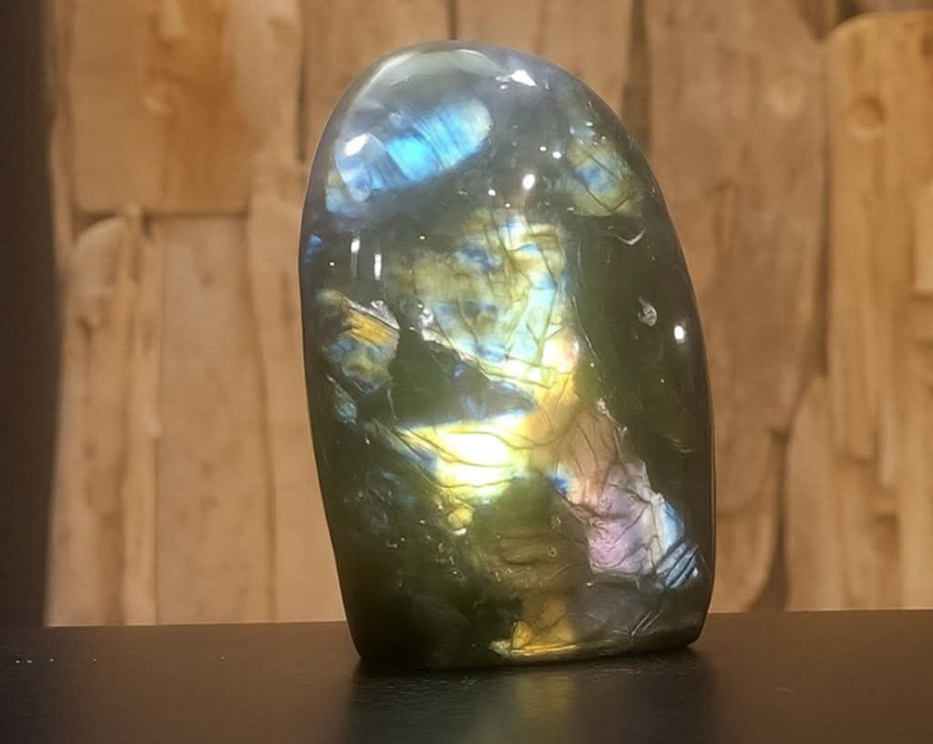 Véritable pierre de mystère, la Labradorite est connue pour son éclat iridescent aux reflets bleus et dorés, rappelant les aurores boréales. Cette pierre polie (hauteur : 11 cm – largeur : 7 cm – poids : 572 g) diffuse une énergie de protection et de régénération. Elle agit comme un bouclier énergétique, absorbant les énergies indésirables tout en renforçant l’aura.
