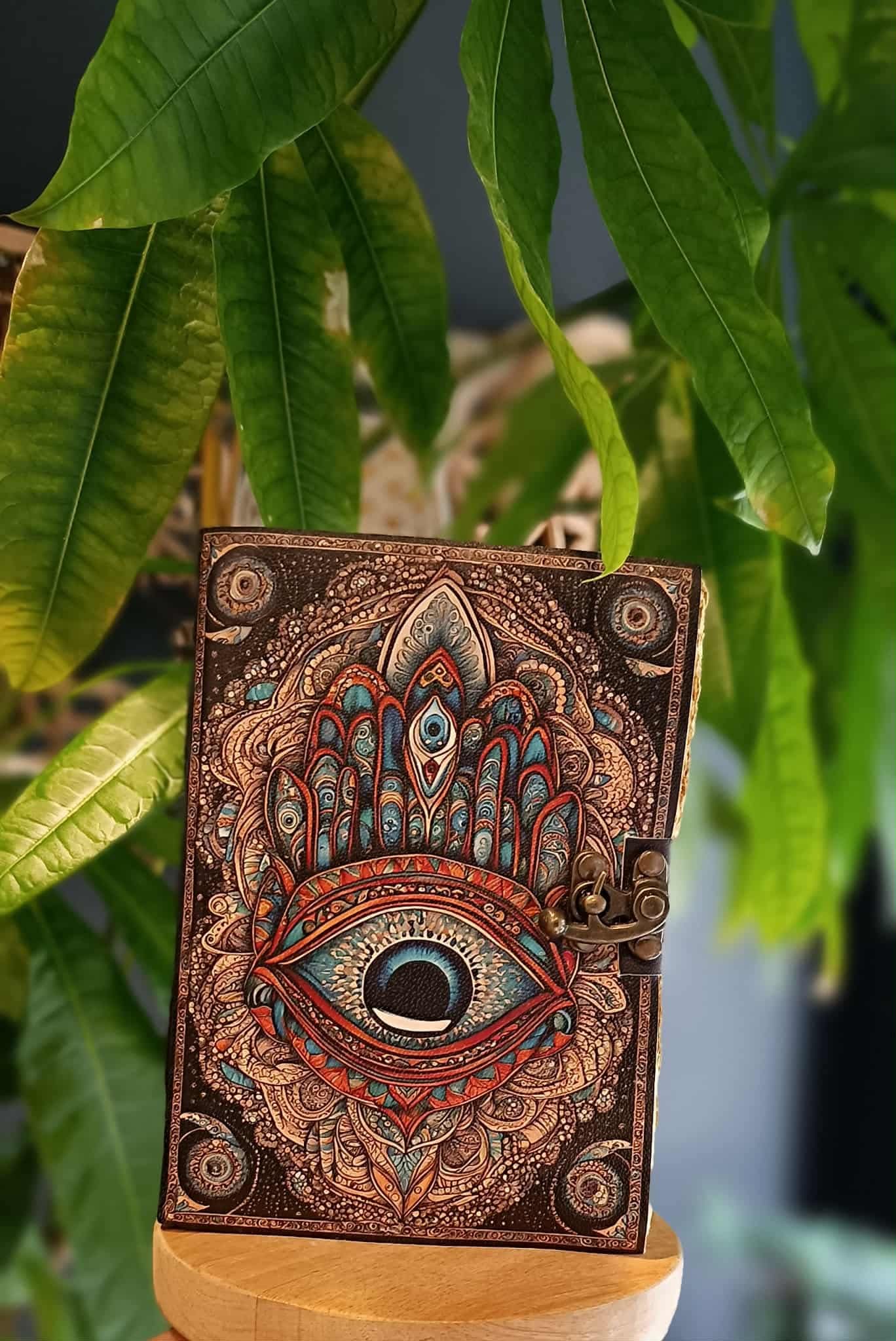 Le Grimoire Main de Fatma est un carnet sacré, alliance d’art et de spiritualité. Sa couverture en cuir synthétique finement travaillée dévoile la Main de Fatma (ou Hamsa), symbole ancestral de protection et de lumière. Au centre, l’œil bienveillant incarne la vigilance intérieure et la sagesse, invitant à écrire sous le regard de la bienveillance universelle.