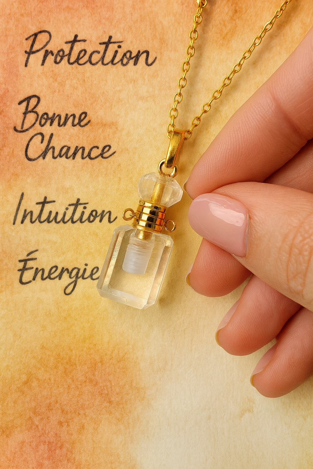 Le pendentif contient une pipette intérieure, permettant de remplir la bouteille avec l’huile essentielle, l’élixir, le parfum ou l’eau vibrée de votre choix. Chaque port devient alors un rituel intime : protection, ancrage, amour, apaisement… selon votre intention du moment.