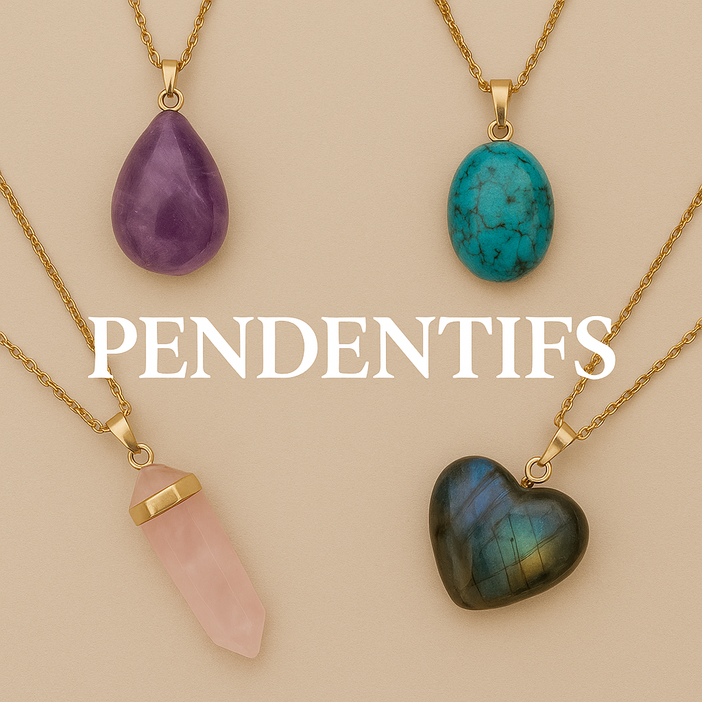 Chaque pendentif est unique, façonné à partir d’une pierre polie et monté sur un anneau métallique discret.