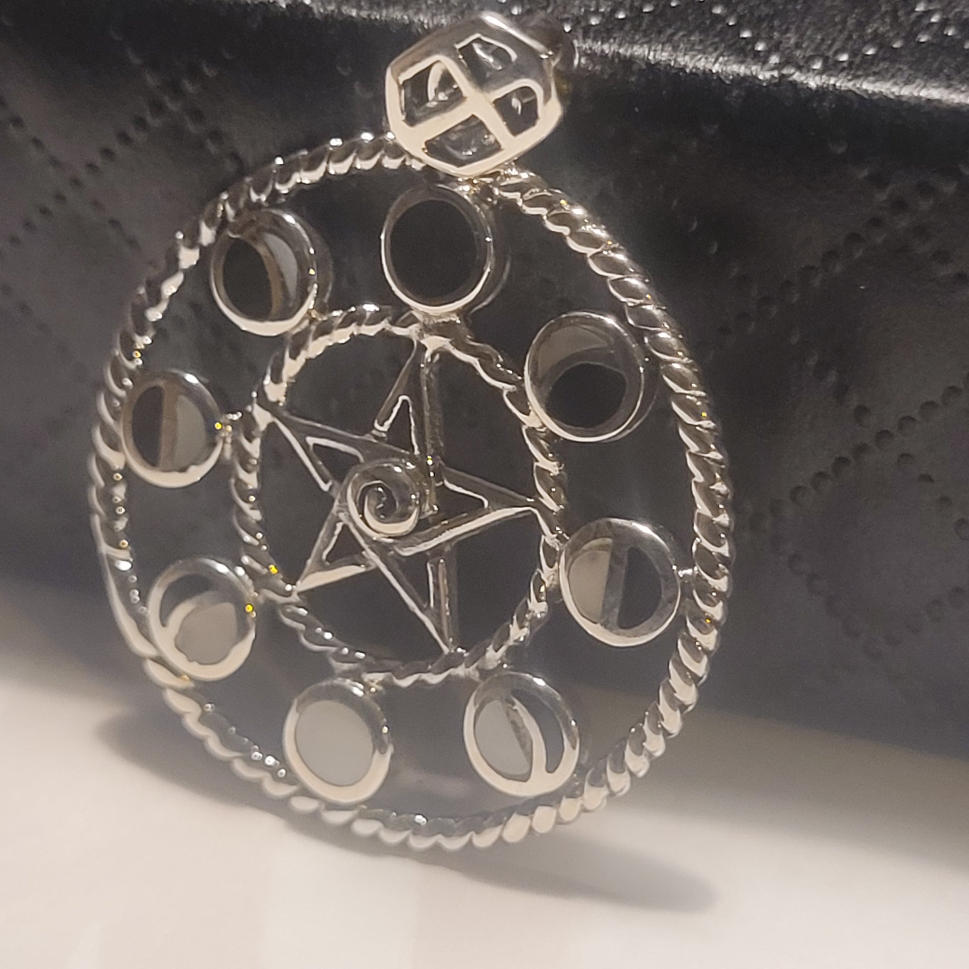 Ce Pendentif Pentacle & Cycles Lunaires en argent 925 associe deux symboles puissants : le pentacle, figure d’harmonie et de protection, et les différentes phases de la Lune, rappelant le mouvement perpétuel de transformation. Le cercle tressé qui encadre l’ensemble renforce l’idée de continuité, de guidance et de retour à soi.