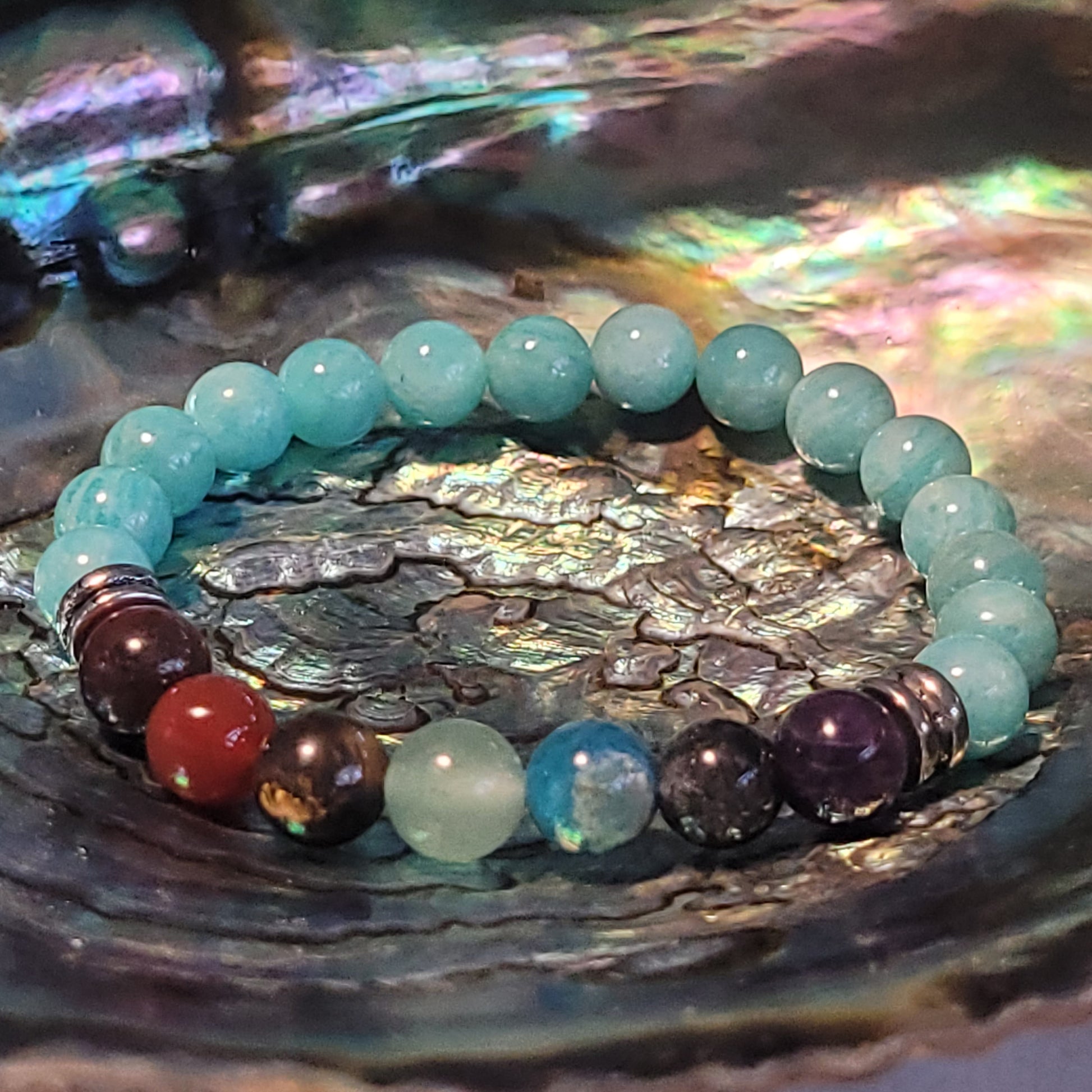 Ce bracelet réunit l’harmonie apaisante de l’amazonite et l’alignement offert par les sept pierres chakra. Il soutient la clarté mentale, favorise une circulation plus fluide de l’énergie et offre un ancrage discret tout au long de la journée. Sa composition naturelle et sa finition élégante en font un allié fiable pour cultiver équilibre, calme et présence.