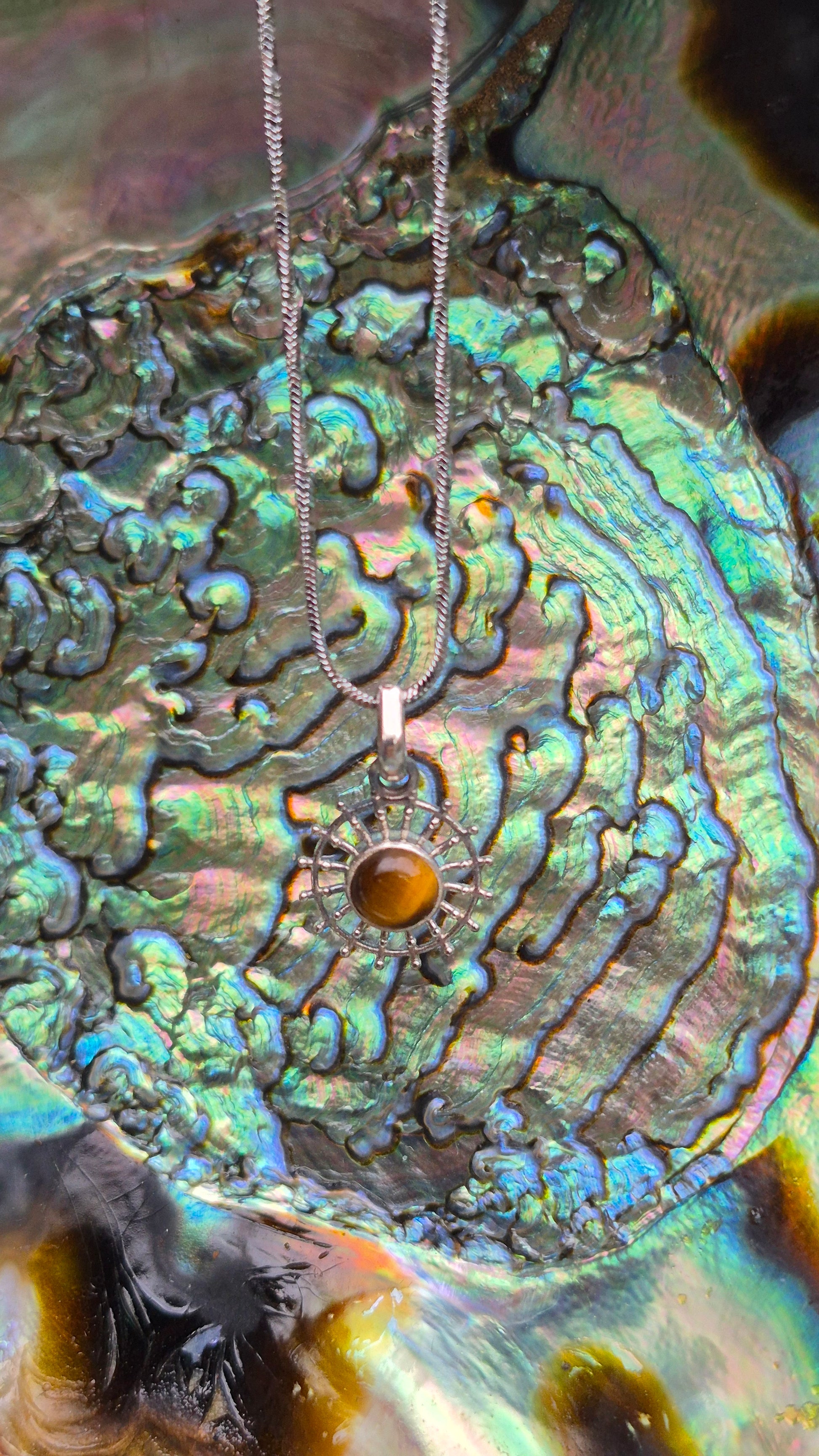 La monture en argent forme un cercle solaire finement travaillé, symbole de clarté, de force intérieure et de rayonnement personnel. Le pendentif est accompagné d’une chaîne en acier inoxydable, solide et hypoallergénique, qui conserve son éclat jour après jour. Ce bijou convient aussi bien au quotidien qu’à des moments plus symboliques, où l’on souhaite s’entourer d’une énergie protectrice.