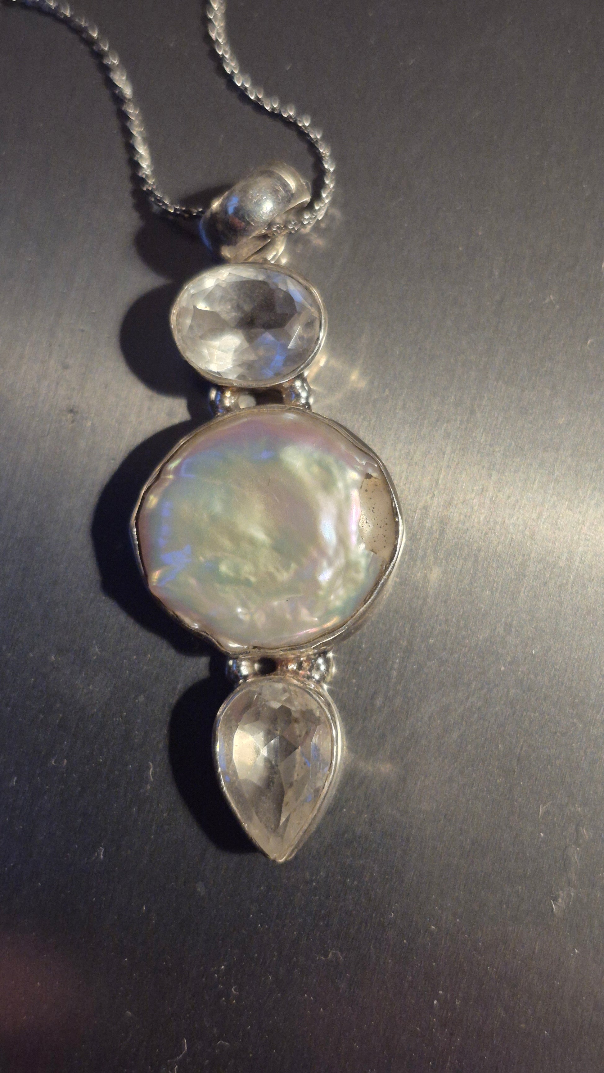 L’ensemble est monté sur une structure en argent qui enveloppe les pierres sans masquer leurs nuances uniques. Les formes se succèdent avec élégance : un cristal facetté scintillant, une large nacre irisée puis une seconde pierre claire en forme de goutte, créant un pendentif équilibré et raffiné. La chaîne en acier inoxydable complète le bijou, garantissant solidité et éclat durable.