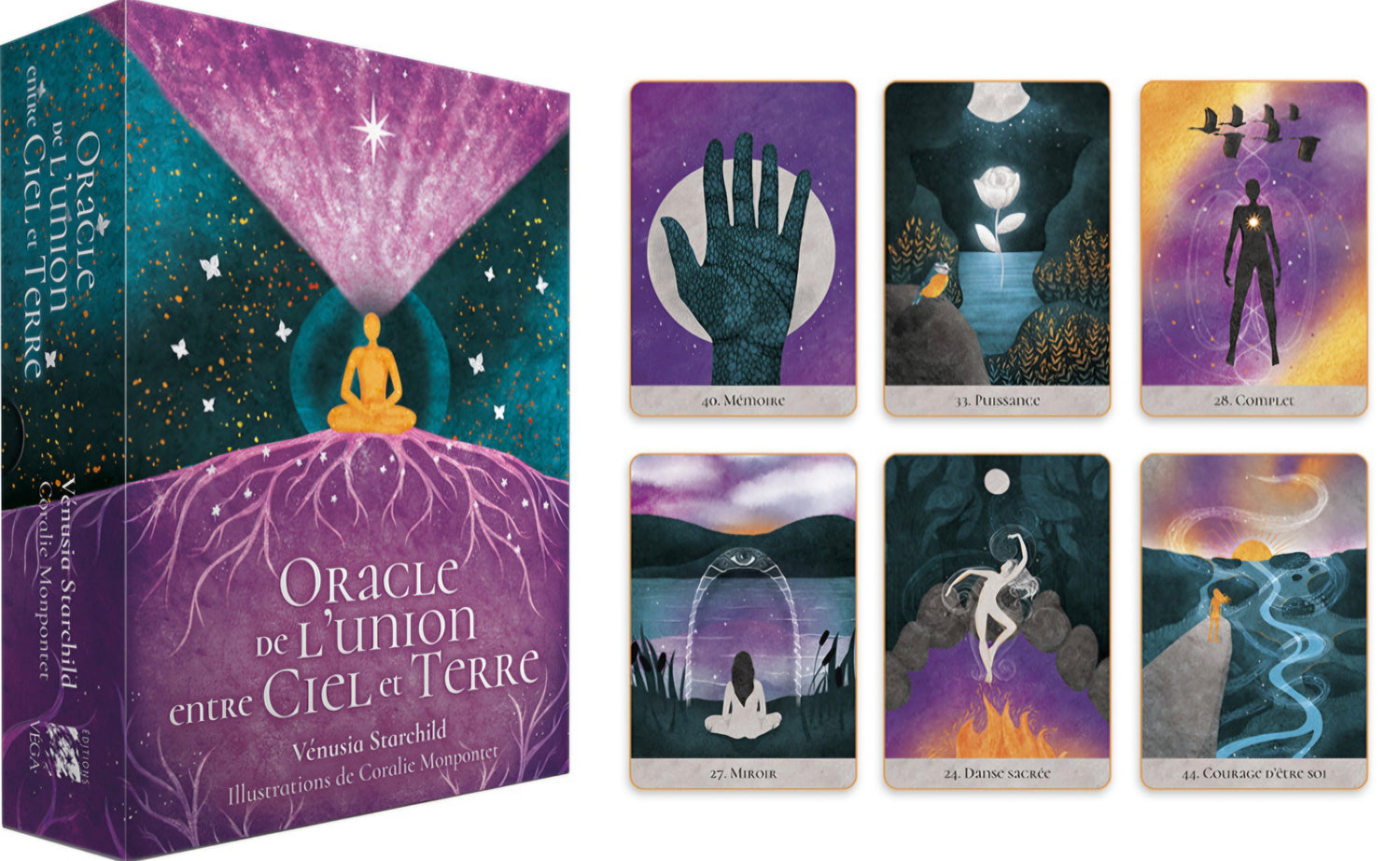 L’Oracle de l’Union entre Ciel et Terre invite à renouer avec l’équilibre fondamental qui relie le spirituel au concret. Conçu par Vénusia Starchild et illustré par Coralie Monponcet, ce jeu propose des cartes empreintes de douceur, de lumière et de profondeur symbolique. Chaque tirage devient un espace de pause, un moment pour écouter votre intuition tout en restant solidement ancré dans le réel.