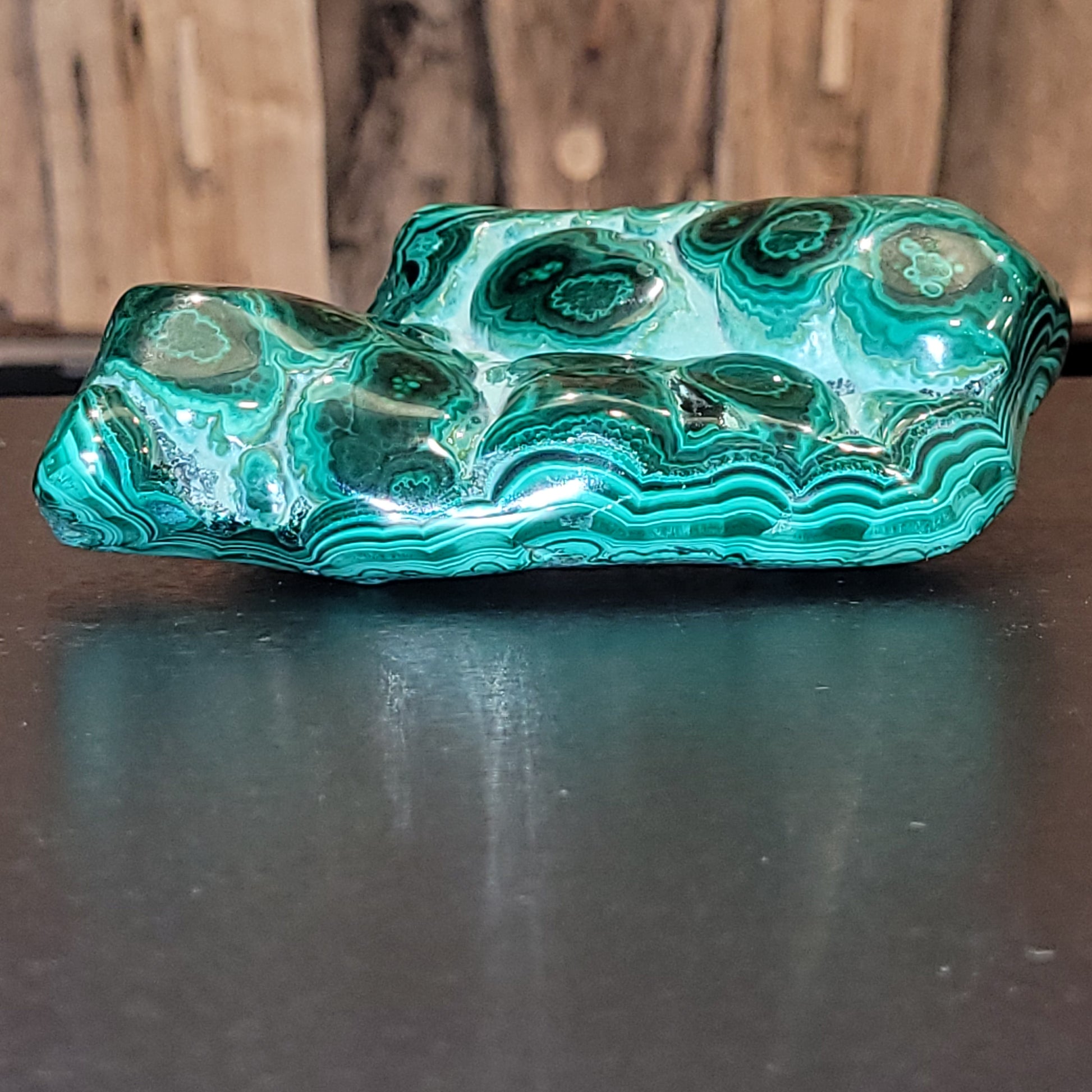 La Malachite est une pierre emblématique de transformation et de protection. Sa couleur verte, vibrante et veinée de cercles hypnotiques, symbolise la régénération et l’énergie du cœur. Ce spécimen poli de 450 g environ est une pièce d’exception, à la fois décorative et vibratoire.