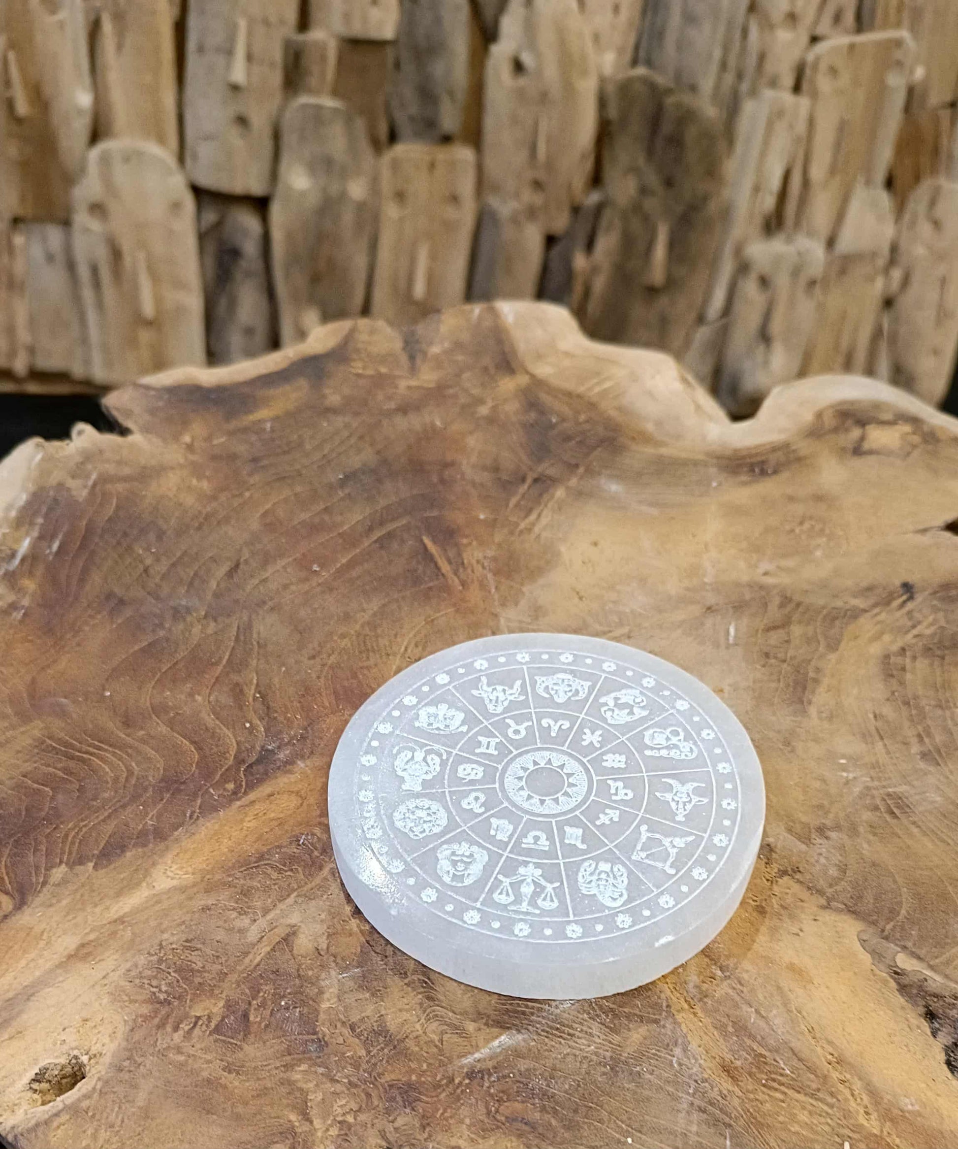 Ce plateau de rechargement en Sélénite est finement gravé des symboles du Zodiaque, représentant les douze signes astrologiques autour d’un centre solaire. D’un diamètre d’environ 10 cm, il diffuse une énergie à la fois apaisante et structurante, propice à l’harmonisation des cycles et des émotions.